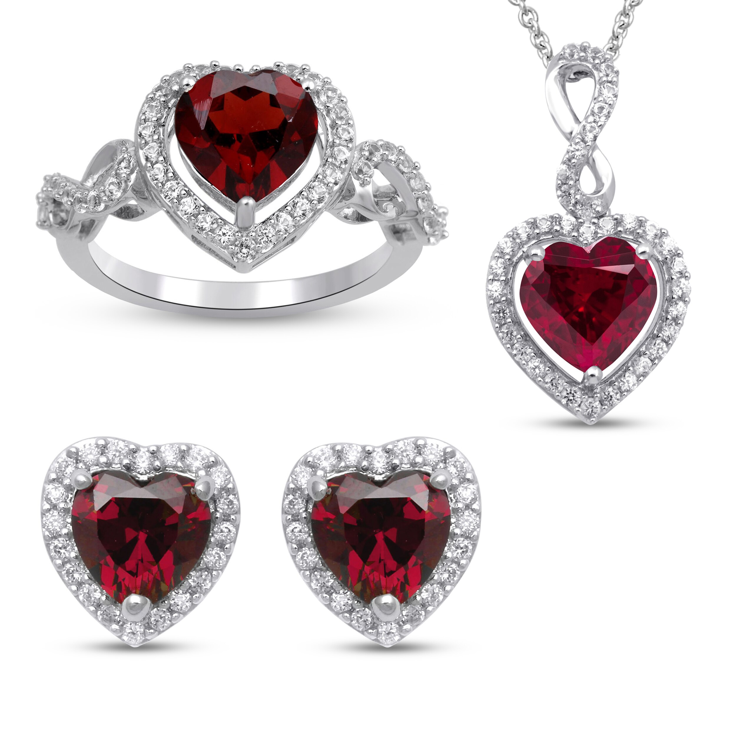 Boxed and ready to gift, there is so much to adore in this coordinating set. Brilliant heart-cut rubies radiate from the center of each piece. The beautiful center stones are further enhanced with multiple round-cut white sapphires and fashioned in sterling silver. The necklace has an 18-inch cable chain and secures with a spring-ring clasp. The stud earrings secure with friction backs. The ring comes available in standard size 7 only.